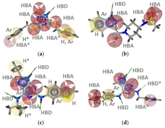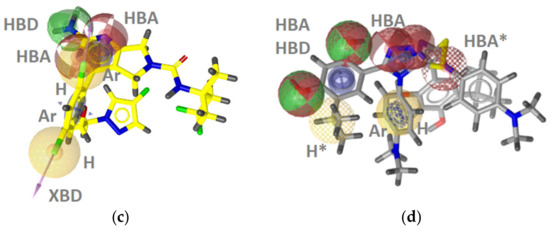 (a) LB-Hsp90-Model-3, (b) LB-Hsp90-Model-4, (c) LB-Hsp90-Model-5, and (d) LB-Hsp90-Model-6 Hsp90 inhibitor ligand-based pharmacophore models. The pharmacophore features are as follows: hydrophobic (H, yellow spheres), aromatic (Ar, blue disc), hydrogen bond donor (HBD, green arrow, or green sphere), hydrogen bond acceptor (HBA, red sphere), and halogen bond (XBD, pink arrow). Optional pharmacophore features are marked with *.