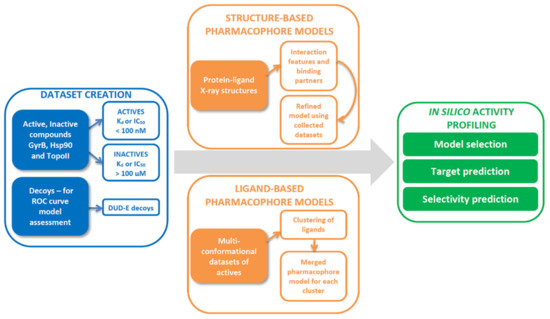 Computer-aided drug design has become a state-of-the-art method in the discovery, rational design, and optimization of bioactive compounds. In particular, the concept of in silico target activity profiling for data mining and ligand selectivity profiling has been established for repurposing drugs, examining off-target liabilities, and identification of targets from phenotypic screening [30]. In addition, 3D-pharmacophores are highly useful and efficient tools for data mining (hit finding) and medicinal chemistry decision support in drug discovery research [31,32]. Furthermore, they have been reported to be highly efficient and accurate virtual screening (VS) filters when compared to docking and shape-based approaches [33]. In relevant studies, cyclothialidines were utilized to identify GyrB subunit inhibitors using 3D-pharmacophore, docking, and VS approaches [34]. Similarly, successful identification of Hsp90 N-terminal and C-terminal domain inhibitors was accomplished using 3D-pharmacophores and VS methodologies [35,36].