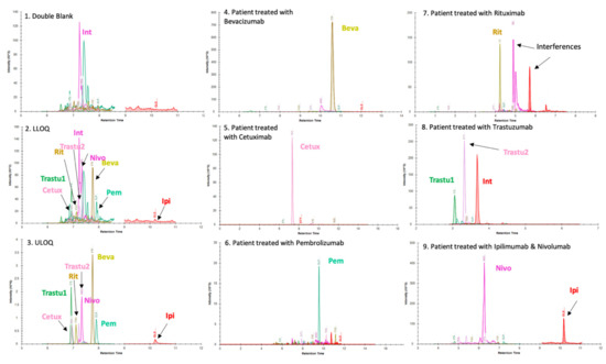 Panels (1), (2) and (3) present chromatographic profiles of double blank drug-free plasma matrix, lower limit of quantification (LLOQ) and upper limit of quantification (ULOQ), respectively. Int: interference. These chromatograms were obtained using a BioZen™ 2.6 µm Peptide XB–C18 LC column and the LC–MS parameters were those described in the Materials and Methods section. Two proteotypic peptides were selected for trastuzumab because both are unique and give intense signals in LC–MS. For the other mAbs, the list of proteotypic peptides was limited because of the sequence homology of mAbs with endogenous IgG (other peptides are not specific). In this context, a single peptide was selected in the quantification method of all mAbs except trastuzumab. Panels (4), (5), (6), (7), (8) and (9) display chromatograms obtained from plasma samples of patients treated with bevacizumab (Beva) (4), cetuximab (Cetux) (5), pembrolizumab (Pem) (6), rituximab (Rit) (7), trastuzumab (Trastu1 & Trastu 2) (8) and combination therapy nivolumab (Nivo) + ipilimumab (Ipi) (9). The retention times of mAbs shown in these panels are different with those observed in panels (1), (2) and (3) because of the use of different chromatographic systems and columns in each laboratory using the kit. Thus, panels (1), (2), (3) were analyzed on SCIEX 6500QTRAP by Promise Proteomics. Panels (4) and (9) were analyzed on SCIEX 6500 QTRAP by PROMISE Proteomics with distinct LC parameters. Panels (5), (6), (7) and (8) were analyzed on a THERMO TSQ Altis at Cochin hospital (Paris, France). Importantly and as visible on (1), (2) and (3), an interfering signal (Int) is present for nivolumab peptide when analyzing plasma samples with a QQQ mass spectrometer. It elutes very close to the peak of interest. This interference can be separated with an appropriate gradient. Lower limit of quantification and linearity.