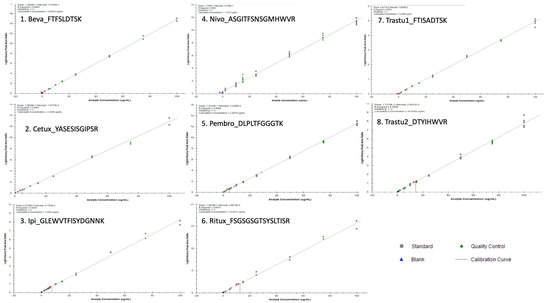 For all mAbs, the LLOQ was 2 µg/mL corresponding to the lowest level of calibration. Standards curves were linear from 2 to 100 µg/mL for all mAbs. Over this concentration range, the regression coefficient (r2) of the calibration curves was always greater than 0.994 with back-calculated calibration samples within ±15% (±20% at LLOQ), as shown in Figure 2. Signal to noise (S/N) ratios calculated by dividing signal area at LLOQ by signal area in double blank samples were 33, 41, 11, 8, 25, 10, 30 and 8 for Beva, Cetux, Ipi, Nivo, Pembro, Ritux, and Trastu-1 or Trastu-2 peptides, respectively. All the validation criteria for linearity were fulfilled.