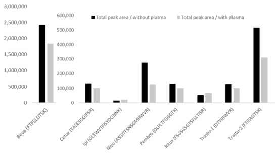 Matrix effect for the different mAbs. Black histograms represent the total area measured for the peptide (mean of MRM transitions) in the absence of plasma, while the grey histograms represent the total area measured for the same peptide and same concentration (mean of MRM transitions) in the presence of plasma. Samples, without and with plasma, were analyzed in 6 replicates from a pool of human plasma samples. CV% between replicates were consistent and below 9% in the absence of matrix, and below 11% in the presence of matrix, except for Nivo where CV% was 19% in the presence of matrix.
