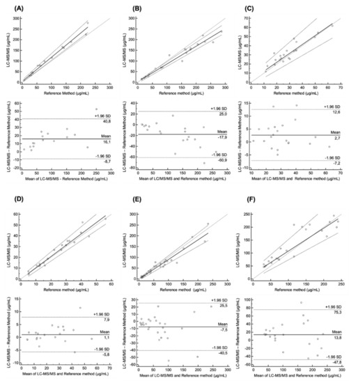 All statistical analyses were performed using MedCalc statistical package version 19.2.6 (MedCalc Software, Mariakerke, Belgium). The Passing-Bablok regression was used to estimate the relationship between the multiplex LC–MS/MS method and the reference method [50]. The regression equation was expressed with the 95% confidence interval (95% CI) for the estimates of slope and intercept. The Bland–Altman plot was used to evaluate method agreement [54]. The numerical results were reported both mean bias and the limits of agreement, including respective 95% confidence intervals (95% LOA).