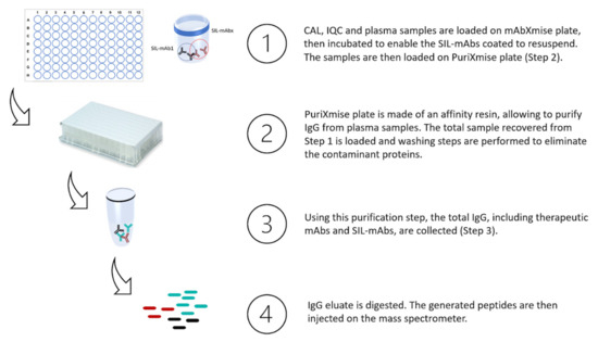 mAbXmise process summarized: collected plasma samples are loaded on mAbXmise plate as well as calibrators and QC samples provided in the kit. Full-length isotopically labelled mAbs, coated on the plate, are resuspended in the plasma samples and will serve as internal quantification standard. Total IgG are purified, recovered, and then digested. At the end of the process, the samples collected are ready to be injected.