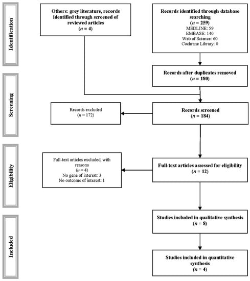 Of the 259 studies identified, 8 met the inclusion criteria and were included in the systematic review [19,20,21,22,23,24,25,26], and 4 were included in the meta-analysis (Table 1 and Figure 1) [20,21,22,24]. Four studies were excluded for various reasons (Supplementary Table S1) [34,35,36,37].