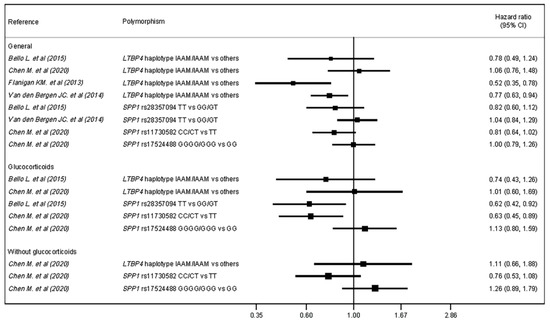 Regarding the glucocorticoid subgroup, the LTBP4 haplotype IAAM was not associated with HR compared with other haplotypes [20,21]. A comparison of the SPP1 rs28357094 TT genotype with the GG/GT genotypes revealed an HR = 0.62 (95% CI = 0.42–0.92) [20]. Finally, regarding SPP1 rs11730582 and rs17524488, only rs11730582 genotype C showed a protective association, with an HR = 0.63 (95% CI: 0.45, 0.89) [21].