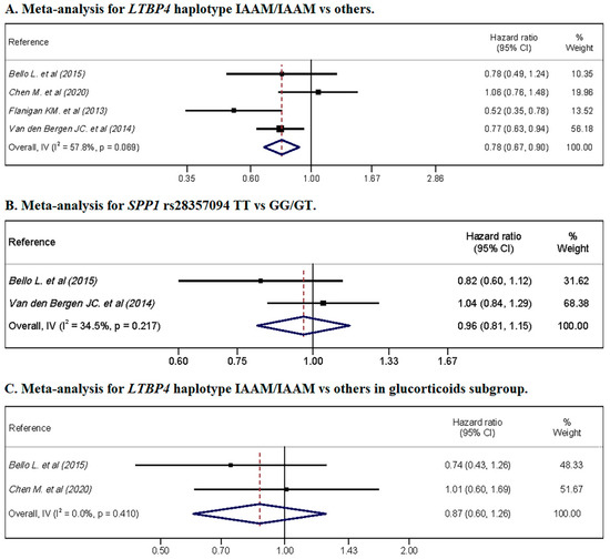 The meta-analysis showed a protective association of the LTBP4 haplotype IAAM, with an HR = 0.78 (95% CI: 0.67, 0.90) (Figure 3A), while SPP1 rs28357094 showed no association (Figure 3B). In the glucocorticoid subgroup, no association was observed for the LTBP4 haplotype IAAM/IAAM (Figure 3C).
