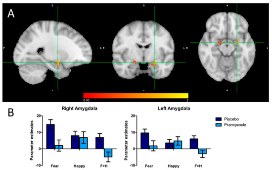 (A) Sagittal, coronal and axial images depicting significantly reduced activation in the pramipexole relative to the placebo group for the fear versus happiness contrast in the left and right amygdala. Peak voxels right amygdala: x = 18, y = −6, z = −14; voxel size: 35; 1 − p = 0.979. Peak voxels left amygdala: x = −24, y = −6, z = -14; voxel size = 83; 1 − p = 0.994. Results are shown TFCE-corrected with a family-wise error cluster significance level of 1 − p > 0.95. (B) Parameter estimates extracted from the significant clusters in response to fearful versus happy faces. Error bars represent the standard error of the mean.