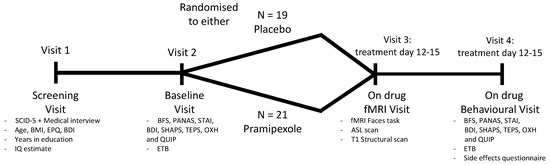 The study employed a parallel-group, placebo-controlled, double-blind design (also see Figure 2). All participants were randomly allocated to either placebo (lactose) or pramipexole treatment. Both treatments were administered in indistinguishable capsules. Participants were instructed to take their treatment as a single dose in the evening. The daily dose of pramipexole started at 0.25 mg pramipexole salt and was subsequently increased by 0.25 mg in a stepwise manner every three days until a target dose of 1.0 mg pramipexole salt per day was reached (dose titration based on Fawcett et al. [33]). Participants took the target dose of 1.0 mg for at least two consecutive days before any on-drug assessments were conducted. After all of the testing was completed, pramipexole was tapered down over three days, decreasing the daily dose by 0.25 mg each day. During their participation, all study volunteers could reach a medical doctor 24 h a day via telephone in case of side effects or concerns related to the treatment.