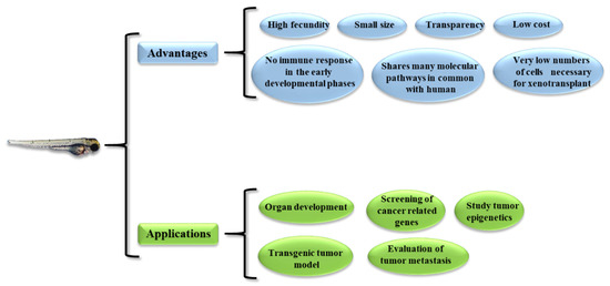 In 1981 [29], the idea to use the zebrafish as a novel vertebrate model organism to study human diseases and test innovative therapeutic molecules/strategies was first proposed. There are several reasons for its use in biomedical research [30,31] (Figure 1). First, zebrafish has a high fecundity, so many animals can be produced in a short time; moreover, both embryos and adults have a small size, so little space is needed for housing. Second, the transparency of both embryos and larvae allows the fate of the injected tumor cells (growth and migration) to be tracked within the animal body. In particular, a genetic strain has been developed that retains much of its transparency into adulthood; however, adults are less transparent than larvae [32]. Third, zebrafish lack an adaptive immune response until about 4 weeks after fertilization, so xenotransplanted cells are not rejected at this time [33]; an immunosuppressed transgenic mutant zebrafish is available if older animals are needed [34]. Finally, the cost of maintaining the zebrafish is much more manageable compared to other animal models, such as rodents.