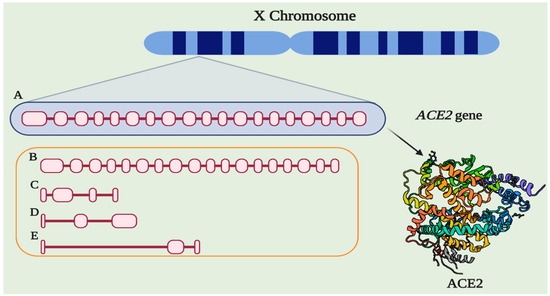 Angiotensin-Converting Enzyme 2 (ACE2) (EC 3.4.15.1) is an 805 amino acid protein encoded by the ACE2 gene located in cytogenetic band 22.2 on the short arm of the X chromosome. The gene is 41,115 base pairs (bp) long and is organized into 19 exons and 18 introns that can give rise to five different transcripts, of which only two are translated into functional proteins (Figure 1) [1]. In addition, there are two paralogs to ACE2, Angiotensin-Converting Enzyme 1 (ACE) and AC113554.1, although no functional protein product has been associated with the latter.