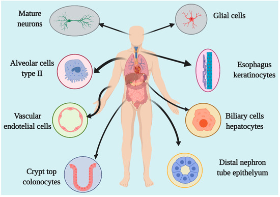 ACE2 is an enzyme located in the cellular membrane of different human body organs, mainly in the epithelium. Through analyses of expression and proteomic databases, as well as in vitro investigations, it has been shown that ACE2 is expressed in the lungs, liver, kidneys, stomach, intestines, arteries and veins, heart, oral mucosa, nasopharynx, colon, thymus, bladder, and central nervous system [6,7,8,9,10]. The primary cells that express this enzyme are stomach epithelial cells, proximal renal tubes, vascular endothelial cells, glia, neurons, spinal cord cells, cholangiocytes, esophageal keratinocytes, ileal and rectal enterocytes, and epithelial oral cavity epithelial cells [7,8,11,12,13]. The lungs are the main organs of expression at the respiratory system level, with type 2 alveolar and pulmonary epithelial cells as the principal cells in ACE2 expression [11]. The expression level depends on the degree of cell differentiation, and mature cells show the highest level of ACE2 expression (Figure 2) [14]. In animal models, it has been demonstrated that ACE2 expression is decreased in males compared to females, although this difference was believed to be due to estrogens [15].