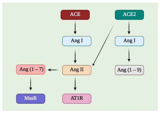 ACE2 is a member of the counter-regulatory axis of the renin–angiotensin system (RAS), and its leading role is to degrade the pro-hypertrophic and profibrotic peptide angiotensin II (Ang II), limiting the adverse effects of angiotensin II. Additionally, it participates in generating angiotensin (1–7) (Ang (1–7)) (Figure 3) in cooperation with neprilysin, mainly in the liver and kidneys; in the lungs, ACE2 works in conjunction with prolyl oligopeptidase (POP) to generate Ang (1–7) [19]. There are different pathways related to the RAS axis; the most-studied is the ACE axis, Ang II, and the angiotensin II type 1 receptor (AT1R), called the classical system, while ACE2, Ang (1–7), and the Mas receptor (MasR) is one of the nonclassical pathways.
