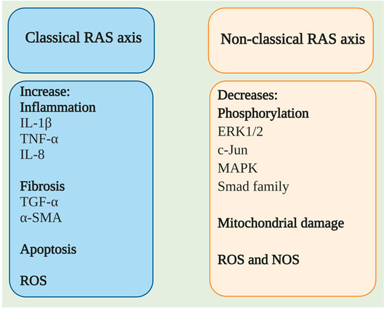 There is an inverse relationship between the ACE/Ang II/AT1R axis and ACE2/Ang (1–7)/MasR; a worsening of the inflammatory processes occurs when this relationship favors the first set, while it favors an increase in the levels of α-smooth muscle actin (α-SMA) and type I collagen at the lung and hepatic levels in fibrotic models [20]. In cellular assays, the phosphorylation levels of vascular endothelial growth factor receptor 2 (VEGFR2), c-Jun, mitogen-activated protein kinase 1/2 (MEK1/2), and extracellular signal-regulated protein kinase (ERK1/2) have been found to decrease via stimulation of the nonclassical pathway of the RAS axis, which significantly inhibits the vascularization processes of tumor cells and pulmonary and hepatic fibrosis and causes injury in the same organs [8,21]. On the other hand, ACE2 affects some oxidative stress pathways via increasing Ang (1–7); if the levels of this enzyme begin to decline, the expression of NADPH oxidases 2/4 (NOX2/NOX4) increases, along with the levels of the reactive oxygen species (ROS) and loss of the stability of the mitochondrial membrane and B-cell lymphoma 2 protein (Bcl2) [22].