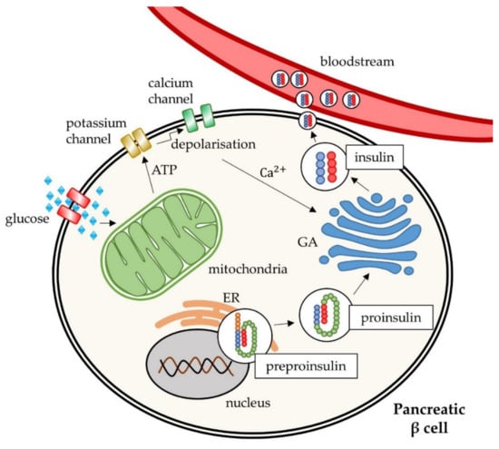 The mechanism of insulin release by pancreatic β-cells. ER: endoplasmic reticulum, GA: Golgi apparatus, ATP: adenosine triphosphate, Ca2+: calcium ion.