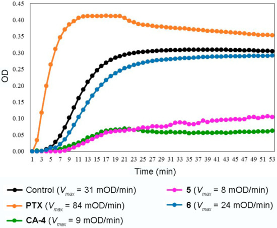Effect of hybrid compounds 5 and 6 on tubulin polymerization. Polymerization reactions were carried out by incubation at 37 °C and followed by absorbance readings at 340 nm for 53 min at 37 °C. CA-4 and PTX were used as positive controls. All compounds were used at a final concentration of 10 µM.