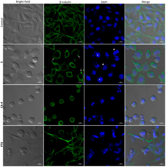 HeLa cells (4 × 105) were seeded on coverslips in 30 mm petri dishes and incubated in DMEM with 10% of fetal bovine serum (FBS) for 24 h with compound 5 (0.16 μM). DMSO (0.01%) was included as negative control and PTX (0.08 μM) and CA-4 (1.49 μM) as positive controls. After removal of the supernatant, the cells were fixed with 4% of paraformaldehyde in phosphate-buffered saline 1× (PBS) pH 7.4 for 1 h at 4 °C and permeabilized with 0.5% Triton X-100-SDS for 10 min. Nonspecific binding was blocked with 3% bovine serum albumin (BSA) in PBS for 1 h at 37 °C. Afterwards, treated cells were incubated with a monoclonal antibody anti-beta-tubulin (Sigma-Aldrich, T0198) diluted 1:1000 in PBS for 1 h at room temperature and washed three times with PBS; subsequently incubation with secondary anti-mouse-FITC antibody (Millipore, AP308F) diluted 1:500 and 4′,6′-diamidino-2-phenylindole (DAPI) at 0.5 µg/mL was carried out for 1 h at room temperature in the dark. The cover slips were washed three times with PBS and mounted on glass slides with Vectashield (Vector Laboratories). Images were acquired on a Nikon Ti Eclipse inverted confocal microscope equipped with an A1 imaging system. Imaging was performed using a 20× (dry, NA = 0.8) objective lens. Excitation was performed sequentially using the laser lines provided by the manufacturer (403 nm—DAPI, 488 nm—FITC, brightfield) and the appropriate emission filters.