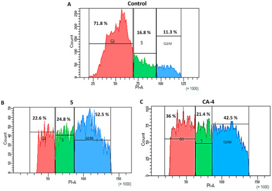 Analysis of cell cycle progression of HeLa cells by flow cytometry: (A) Control cells, (B) treated with compound 5, (C) treated with CA-4. HeLa cells were treated with compound 5 (0.16 μM) and CA-4 (1.49 μM) for 48 h.