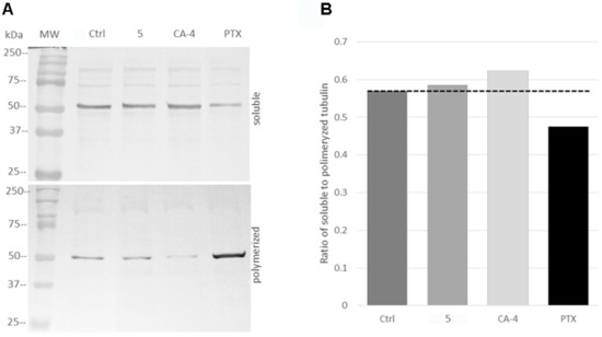 IFI assays showed that compound 5 induced alterations in the microtubule network. Then, to identify the mechanism by which compound 5 affects the stability of microtubules, soluble and polymerized tubulin protein obtained from treated HeLa cells were analyzed by Western blotting. PTX and CA-4 were included as microtubule stabilizing and destabilizing agents, respectively, and DMSO as a negative control. In control and treated samples, bands of 50 kDa corresponding to beta-tubulin were detected (Figure 6A). Densitometric analysis showed that in cells treated with CA-4 or compound 5, the fraction of soluble tubulin increased in comparison to the control condition or PTX treatment. On the contrary, in cells treated with PTX, an increase of polymerized tubulin was evident. The ratio of soluble to polymerized tubulin fractions was determined for each compound and changes in the tubulin polymerization state following drug treatment were evidenced (Figure 6B). PTX showed a lower ratio of soluble-to-polymerized tubulin compared to control due to its stabilizing effect of the polymerized state of tubulin proteins. Meanwhile, CA-4 and compound 5 displayed a higher soluble-to-polymerized tubulin ratio in comparison to control or PTX. This suggests that compound 5 exhibits an inhibitory activity of tubulin polymerization similar to that of CA-4. This inhibitory activity was indeed observed in the tubulin polymerization assay.