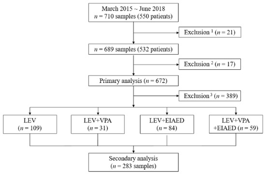 Study workflow. Abbreviations: LEV, levetiracetam; VPA, valproic acid; EIAED, enzyme-inducing antiepileptic drug. 1 Incomplete or unavailable medical record. 2 Below the lower limit of quantification. 3 Pediatric/elderly patient samples, intravenous injections, non-steady state samples, follow-up loss, low compliance, dose change, underlying liver and/or kidney diseases in addition to epilepsy.