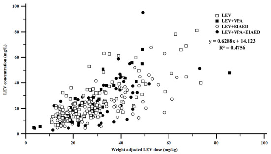 Correlation between weight-adjusted dose and concentration of levetiracetam (ρ = 0.6896, p < 0.0001, n = 283). Abbreviations: LEV, levetiracetam; VPA, valproic acid; EIAED, enzyme-inducing antiepileptic drug.
