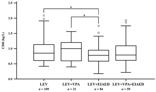 Dose-adjusted serum LEV concentrations (CDR) were compared between the four groups. CDR was calculated as follows: