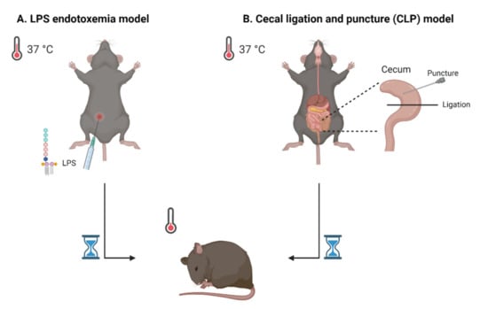 Schematic representation of two frequently used sepsis models. (A) The lipopolysaccharide (LPS) endotoxemia model implies injection (mostly intraperitoneally) of the PRR agent LPS. (B) The cecal ligation and puncture (CLP) model is established by puncturing and ligating the cecum, by which feces can enter the peritoneal cavity. In both models, one of the disease symptoms is hypothermia, which can be monitored by measuring body temperature. Figure created with BioRender.com.