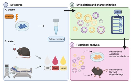 General set-up for functional analysis of extracellular vesicles (EVs). (1) EVs obtained via different approaches can be investigated in the context of sepsis or systemic inflammation. The specific cell type of interest (e.g., macrophages or neutrophils) can be stimulated in vitro (1A) followed by collection of EV containing culture medium for further analysis. Several experimental stimuli are used to stimulate the cells, including lipopolysaccharide (LPS), cytokines or bacteria. Alternatively, EVs can be isolated from biofluids such as cerebrospinal fluid (CSF), blood or urine derived from septic mice or human sepsis patients (1B). (2) EVs can be separated from the EV-containing sample via different isolation techniques. Following EV isolation, several characterization measures as proposed by the minimal information for studies of extracellular vesicles (MISEV) guidelines need to be implemented to assure the EVs are explored in the appropriate and most standardized way. (3) Next, purified EVs can be incubated with a cell type of interest, whereafter the effects on sepsis-related processes such as inflammation, apoptosis and anti-bacterial activity can be studied in vitro. The recipient cells of choice can be pretreated with an experimental stimulus as described in (1) or left in a naïve state. On the other hand, purified EVs can be administered to mice to study the EV-related effects on inflammation, organ damage and survival in vivo, in comparison with the effects of EVs isolated from control conditions. The subject of EV (pre)treatment can be a naïve mouse or a sepsis mouse. Figure created with BioRender.com.