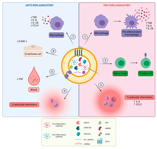 Sepsis is characterized by an initial exaggerated, uncontrolled pro-inflammatory response to infection, followed by a prolonged anti-inflammatory state of immunosuppression. Research on EV content in septic conditions revealed that septic EVs can contribute to the spreading of inflammation and exert both pro- and anti-inflammatory characteristics (Figure 3).