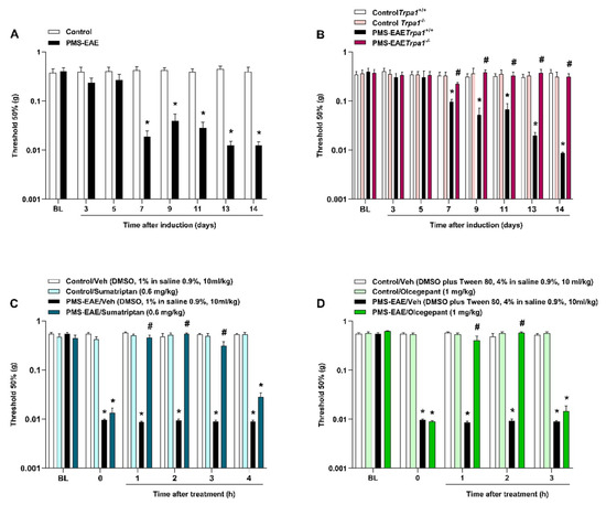 Progressive multiple sclerosis model by experimental autoimmune encephalomyelitis (PMS-EAE) caused PMA development, but Trpa1−/− mice induced to PMS-EAE did not develop PMA and antimigraine agents’ treatment reduced periorbital nociception. (A) Development of PMA 7 to 14 days after induction of PMS-EAE. (B) Absence of PMA in TRPA1 knockout mice after PMS-EAE induction when compared to control (Trpa1+/+). Intragastric (i.g.) administration of (C) sumatriptan (0.6 mg/kg) and intraperitoneal (i.p.) injection of (D) olcegepant (1 mg/kg) 14 days post-induction (p.i.) reduced the PMA generated by the PMS-EAE model. The vehicle group received dimethyl sulfoxide-DMSO 1% in isotonic saline 0.9% i.g. (sumatriptan) or 4% DMSO plus 4% Tween 80 in isotonic saline 0.9% i.p. (olcegepant). Basal (BL) values were observed before PMS-EAE induction. Data are expressed as mean + SEM (n = 6–8) in the graphs. * p < 0.05, when compared to the control group or baseline values (Two-way ANOVA, followed by Bonferroni’s post hoc test); and # p < 0.05 when compared with PMS-EAE vehicle-treated group (Two-way ANOVA, followed by Bonferroni’s post hoc test)].