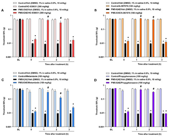 TRPA1 antagonists attenuated periorbital mechanical allodynia (PMA) in the progressive multiple sclerosis model induced by experimental autoimmune encephalomyelitis (PMS-EAE) in mice. All drugs were administered on day 14 post-induction (p.i.), and antinociceptive effects were observed from 1 up to 3 h after intragastric (i.g.) treatment. (A) HC-030031 (300 mg/kg), (B) A-967079 (100 mg/kg), (C) metamizole (100 mg/kg), and (D) propyphenazone (100 mg/kg) were tested for PMA induced by PMS-EAE. The vehicle group received dimethyl sulfoxide (DMSO) 1% in isotonic saline 0.9% by i.g. administration. Baseline values (BL) were observed before PMS-EAE induction. Data are expressed as mean + SEM (n = 6–8) in the graphs. * p < 0.05, when compared to the control group or baseline values; # p <0.05, when compared to the group treated with the PMS-EAE vehicle group (Two-way ANOVA, followed by the Bonferroni post hoc test).