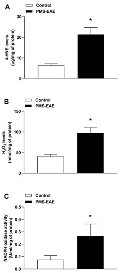 The development of MS is characterised by an extensive inflammatory process and oxidative stress in the CNS, and the lesions lead to a meningeal irritation, as well as the production of reactive species and activation of trigeminal primary afferent nociceptive neurons [87,88]. Different facial pain models show alterations in the oxidative stress parameter and TRPA1 agonist levels [8,9]. Additionally, the PMS-EAE model showed an increase in 4-HNE levels and NADPH oxidase activity in the spinal cord [44]. Moreover, it has been reported that NADPH oxidase is involved in MS physiopathology by leading the generation of reactive species, and its increase has been shown in the brain, and spinal cord samples of PMS-EAE-induced mice [89].