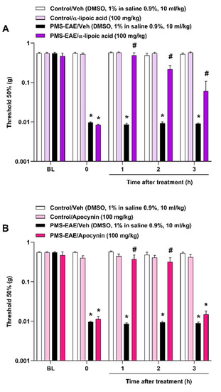The intragastric treatment with α-lipoic acid and apocynin attenuated periorbital mechanical allodynia (PMA) in the progressive multiple sclerosis model induced by experimental autoimmune encephalomyelitis (PMS-EAE) in mice. The administration of (A) α-lipoic acid (100 mg/kg) or (B) apocynin (100 mg/kg) intragastrically (i.g.) was performed on day 14 post-induction (p.i), and their antinociceptive effects were observed from 1 up to 3 h. The vehicle group received dimethyl sulfoxide (DMSO) 1% in isotonic saline 0.9% i.g. Baseline values (BL) were observed before PMS-EAE induction. Data are expressed as mean + SEM (n = 6–8) in the graphs. * p < 0.05 when compared to the control group or baseline values; # p < 0.05 when compared to the PMS-EAE group treated with the vehicle (Veh) (Two-way ANOVA followed by Bonferroni’s post hoc test).