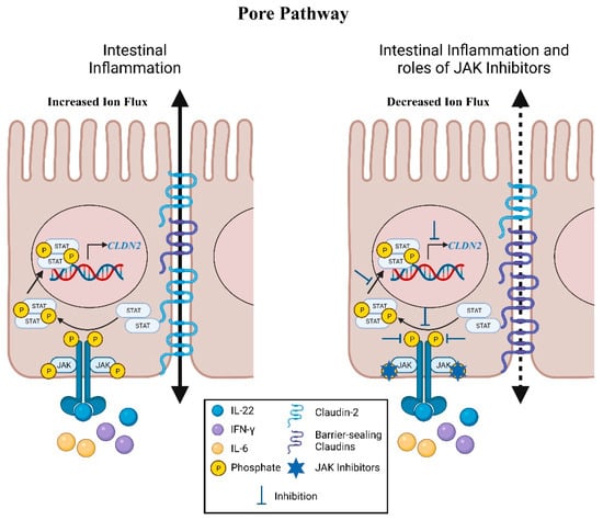 JAK-STAT regulation of intestinal permeability: Pore Pathway. During intestinal inflammation, proinflammatory cytokines are released and bind to their respective receptors on intestinal epithelial cells. The associated cellular tyrosine kinases, JAKs, are then brought together and activated. These interactions subsequently lead to phosphorylation of the cytokine receptor which act as hubs for STATs. The JAKs would then phosphorylate the STATS and the phosphorylated STATs would dimerize, enter the nucleus, and serve as transcription factors for genes that express tight junction proteins which influence intestinal permeability. In the pore pathway, claudin-2 expression is upregulated in response to IL-22, IFN-γ, and IL-6. Expression of barrier-sealing claudins is reduced; however, the mechanisms that underlie these alterations require further investigation. The JAK inhibitors tofacitinib, AZD1480, and JAK inhibitor I, reduce expression of claudin-2 and consequent paracellular permeability via the pore pathway. Downregulation of claudin-2 expression has also been reported with STAT1 and STAT3 siRNA intervention. Levels of barrier-sealing claudins are suggested to return to normal levels during remission of inflammation. These illustrations were made using BioRender. (CLDN2: Claudin-2 Gene, JAK: Janus Kinase, STAT: Signal Transducer and Activator of Transcription).