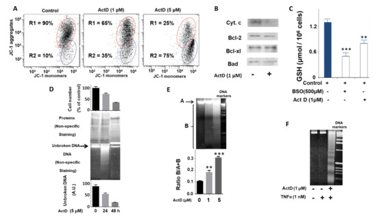 Characterization of the effect of ActD on the biochemical and cellular parameters of the HepG2 cell line. (A) Dose-dependent effect of ActD treatment for 24 h on the mitochondrial membrane potential (ΔΨm) monitored by jc-1 dye. Control conditions (5% FBS). The experiment is representative of three others with similar results. (B) Cytochrome c, Bcl-2, Bcl-xl, and Bad levels obtained by immunoblot in control conditions (5% FBS) or after ActD (1 µM) treatment for 24 h. The experiment is representative of three others with similar results. (C) GSH levels in control conditions (5% FBS) or after ActD (1 µM) treatment for 24 h. As a negative control GSH was measured in the presence of BSO (L-buthionine-(S, R)-sulfoximine) (500 µM) for 24 h. (D) Cell number, protein profile, DNA integrity, and evaluation of unbroken DNA of HepG2 cells after Act D (5 µM) treatment at different times. (E) Dose-dependent effect of ActD at 24 h of treatment on DNA integrity (upper panel). The bar graph (lower panel) represents the ratio between the fragmented DNA and the total (unbroken plus fragmented) DNA. (F) DNA laddering in samples from HepG2 cells treated with Act D (1 μM) and TNF-α (1 nM) for 24 h. Significance levels: ** p < 0.01; *** p < 0.001.