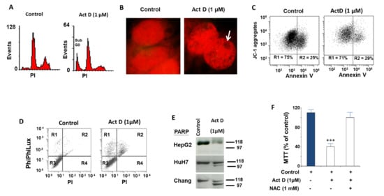 (A) Cell cycle analysis by flow cytometry using propidium iodide staining. The sub-G0 population of HepG2 cells treated for 24 h with ActD (1 μM) in the presence of FBS (5%) increased 3-fold with respect to the control cells (5% FBS). The experiment is representative of three others with similar results. (B) Microscopic analysis of the nucleus stained with propidium iodide of the HepG2 cell incubated as explained in panel (A), 20× (C). Study by flow cytometry of the binding of Annexin V to the cell surface of live cells measured using a JC-1 probe. HepG2 cells were incubated as explained in panel (A). The experiment is representative of three others with similar results. (D) Study of caspase 3 activation by flow cytometry using a PhiPhilux probe. A HepG2 cell incubated as explained in panel (A). The experiment is representative of three others with similar results. (E) Analysis of PARP proteolysis using western blot in different HCC cell lines treated as explained in panel (A). The experiment is representative of three others with similar results. (F) Measurement of the MTT reducing ability of HepG2 cells in control conditions (5% FBS), in the presence of NAC (N-Acetyl-L-cysteine) (1 mM) plus ActD (1 µM) or with ActD (1 µM) for 24 h. Significance levels: *** p < 0.001.