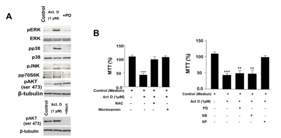 We observed that ActD (1 µM) incubation for 24 h activated the phosphorylation of MAP kinases (ERK1/2, p38, and JNK) and AKT/P70S6K (Figure 3A). We observed that PD098059 inhibits all the MAP kinases studied as well as P70S6K. This is due to the fact that this drug inhibits the mitogen-activated protein kinase kinase-1 (MAPKK1), which is upstream of the signaling cascade of MAP kinases [33]. However, ActD had an effect on the activation of AKT, which was completely inhibited by the drug wortmannin that acts on PI3K. Therefore, our results suggest that ActD acts on MAPKK1 and AKT through independent mechanisms. To elucidate the signaling pathways involved in the cytotoxic effect of ActD, we co-treated the HepG2 cells with specific kinase inhibitors and with N-Acetyl-L-cysteine (NAC) (Figure 3B,C). We observed that wortmannin (PI 3K inhibitor), SP600125 (JNK inhibitor), and NAC were able to reverse the effect of ActD. Thus, the data suggest that the toxic effect of ActD is dependent on the emergence of free radicals and/or GSH depletion and the activation of the JNK and AKT pathways.