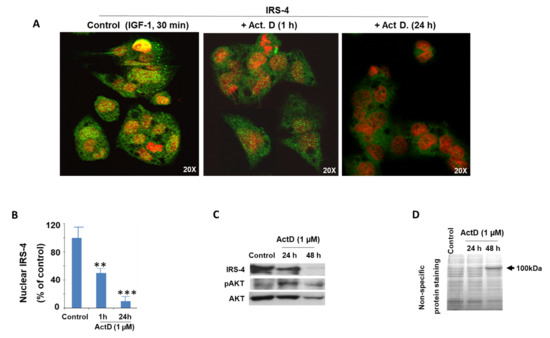 Our group observed that IRS-4 plays an important role in cell proliferation and the inhibition of cell death in the HepG2 line [31], so we sought to determine whether ActD treatment affected IRS-4 levels. When we incubated the cells with IGF-1 (25 nM) for 1 h, after a period of 24 h in the absence of 5% FBS, we used confocal fluorescence microscopy to observe an increase in IRS-4 in the nuclei of cells (green staining). However, when we added ActD (1 µM), there was a rapid decrease in IRS-4 levels in all cell compartments (Figure 4A). The nuclei were stained with PI (red staining). In Figure 4B we can observe changes in the optical density of IRS-4 in the nuclei of cells. We corroborated the microscopy results using western blot analyses (Figure 4C). At incubation with ActD for 48 h, we observed the complete degradation of IRS-4 with the total AKT also affected but to a lesser extent; however, pAKT levels remained high (Figure 4C). As a control we visualized the cells using Coomassie Blue, a nonspecific protein stain (Figure 4D). We did not observe changes in the protein profile at 24 h of treatment with ActD; however, important differences were detected at 48 h with the apparition of a 100kDa band (Figure 4D). These data indicate that the decrease in IRS-4 at 24 h of ActD (1 µM) incubation is not due to general protein degradation.