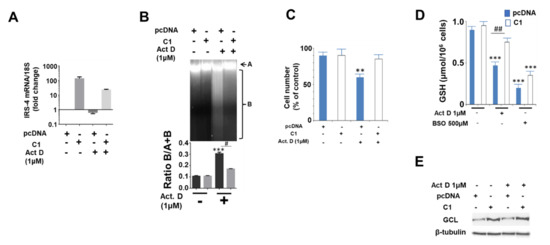 Previous research has demonstrated that the stable transfection of pcDNA (IRS-4) increased IRS-4 protein levels in HepG2 cells (C1 line) in comparison to a control group (pcDNA empty vector) [26]. In Figure 5A, we show the levels of IRS-4 mRNA in both C1 and control cells (pcDNA). Treatment with ActD (1 µM) for 24 h decreased IRS-4 mRNA levels in both the C1 and control cells, but this decrease was minimized in the C1 line (Figure 5A).