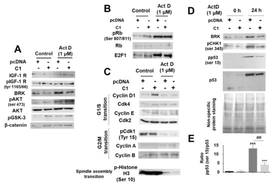 We observed that incubation with ActD (1 µM) for 24 h activated the phosphorylation of AKT and GSK-3 through a mechanism independent from the IGF-1 receptor since we did not detect changes in either the levels of the IGF-1 receptor or in its phosphorylation state (Figure 6A). Interestingly, we did observe an increase in the BRK enzyme in presence of ActD. This enzyme is capable of phosphorylating AKT and directly activating it (Figure 6A). The overexpression of IRS-4 was accompanied by a slight decrease in BRK levels without notable changes in the IGF-1R-AKT-GSK-β-catenin system (Figure 6A). The activation of AKT following ActD (1 M) incubation for 24 h was accompanied by an increase in pRb (ser 807/811) and E2F (Figure 6B). However, biomarkers for the G1/S transition (Cyclin D-Cdk4, Cyclin E-Cdk2) did not increase and biomarkers for the G2/M transition, such as pCdk1 (Tyr 15) and pH3 (ser 10), were markedly decreased compared to the control (Figure 6C). In addition, we observed an increase in pCHK1 (ser 345), pp53, and p53 following ActD (1 µM) treatment for 24 h (Figure 6D). These results suggest a blockage of the cell cycle in G2/M phase induced by ActD, consequently generating an increase in the BRK-pCHK1-p53 cascade (Figure 6D). Following ActD treatment, p53 levels increased, both in relation to its phosphorylation and in quantity (Figure 6D). The total amount of protein stained with Coomassie Blue was used as a charge control for the electrophoresis (Figure 6D, lower panel). In Figure 6E, we show the effects of ActD on the phosphorylated p53/total protein level ratio. As we can see in the different panels of Figure 6, the overexpression of IRS-4 (colony C1) did not produce appreciable changes following the ActD treatment either in the signaling cascade (Figure 6A) or in the Rb-E2F cascade (Figure 6B), or in the enzymes involved in the control of G1/S and G2/S transitions (Figure 6C). However, we did observe a consistent decrease in BRK-pCHK1 and pp53/p53 cascades in C1 cells with respect to the control cells following ActD treatment (Figure 6D,E).