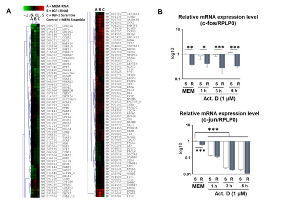 Microarray gene expression profile of HepG2 cells. (A) Hierarchical clustering analysis of the gene expression profiles of HepG2 cells corresponding to the following groups: MEM RNAi (IRS-4 mRNA levels were decreased by knockdown and maintained for 24 h in MEM); IGF-1 RNAi (IRS-4 mRNA levels were decreased by knockdown and maintained for 24 h in IGF-1 (25 nM)); IGF-1 scramble (mRNA levels from HepG2 cells treated with scrambled oligos and maintained for 24 h in IGF-1 (25 nM)). The expression levels of the mRNA from the three groups were compared with the control (mRNA levels from HepG2 cells treated with scrambled oligos and maintained for 24 h in MEM). The experiment is representative of two others with similar results. (B) Relative mRNA expression levels of c-fos and c-jun obtained by a qPCR in the HepG2 cells in which IRS-4 mRNA levels were decreased by knockdown (R) or were treated with scrambled oligos (S). HepG2 cells were maintained in MEM or in the presence of ActD (1 µM) for 1, 3, or 6 h. RPLP0 was used as control of expression. Significance levels: * p < 0.05; ** p < 0.01; *** p < 0.001.