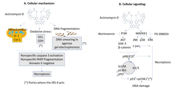 Actinomycin D (ActD) is an FDA-approved NCI oncology drug that specifically targets and downregulates stem cell transcription factors, which leads to a depletion of stem cells within the tumor bulk. Recently, our research group demonstrated the importance of IRS-4 in the development of liver cancer. In this study, we evaluated the protective effects of IRS-4 against ActD. For this study, three hepatocellular carcinoma cell lines (HepG2, Huh7, and Chang cells) were used to study the mechanism of actinomycin D. Most assays were carried out in the Hep G2 cell line, due to the high expression of stem cell biomarkers. We found that ActD caused HepG2 cell necroptosis characterized by DNA fragmentation, decreased mitochondrial membrane potential, cytochrome c depletion, and decreased the levels of reduced glutathione. However, we did not observe a clear increase in apoptosis markers such as annexin V presence, caspase 3 activation, or PARP fragmentation. ActD produced an activation of MAP kinases (ERK, p38, and JNK) and AKT. ActD-induced activation of AKT and MAP kinases produced an activation of the Rb-E2F cascade together with a blockage of cell cycle transitions, due to c-jun depletion. ActD led to the inhibition of pCdK1 and pH3 along with DNA fragmentation resulting in cell cycle arrest and the subsequent activation of p53-dependent cell death in the HepG2 cell line. Only JNK and AKT inhibitors were protective against the effects of ActD. N-Acetyl-L-cysteine also had a protective effect as it restored GSH levels. A likely mechanism for this is IRS-4 stimulating GCL-GSH and inhibiting the Brk-CHK1-p53 pathway. The assessment of the IRS-4 in cancer biopsies could be of interest to carry out a personalized treatment with ActD.