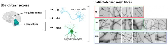 Simplified illustration of the differences of α-syn deposition and structure in PD, DLB, and MSA neurodegenerative diseases. In particular, LB-rich brain regions deposited in the cingulate cortex are thought to be specific for PD and DLB, while depositions within the cerebellum are specific for MSA. Additionally, inclusions of α-syn are found in neuronal cells in PD and DLB. Conversely, in MSA these inclusions are found in oligodendrocytes ((left), visualized with BioRender). Structural differences of α-syn have been reported in patient-derived α-syn fibrils (right). (Adapted from [24] and visualized with BioRender).