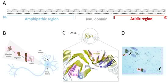 (A) Primary structure of α-syn with highlighted regions: N-terminal (in blue), NAC (in grey), and C-terminal (in red). (B) Conformational states of α-syn (adapted from [41] and visualized with BioRender). (C) Solid-state NMR atomic-resolution (4.8 Å) of α-syn fibrils (PDB ID: 2n0a, adapted from Twohig et al. [42]) with putative binding sites: binding site 2 (BS2; in blue), binding site 9 (BS9; in pink), binding site 3/13 (BS3/13; in orange) on α-syn fibrils (reprinted with permission from [43]. Copyright 2018 American Chemical Society. Structure of α-syn was imported from PDB and visualized with MOE 2018). (D) The α-syn pathology of PD with two pigmented nerve cells containing LB (red arrows) and LN (black arrows). (Adapted from [19]).