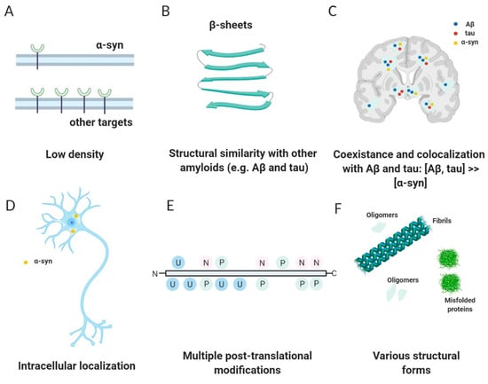 Challenges and characteristics of an ideal α-syn tracer. (Reprinted with permission from [56]. Copyright 2014 the Society of Nuclear Medicine and Molecular Imaging, Inc.) (A) Low density and concentration of α-syn in comparison with other targets. (B) Structural similarity with other proteins such as Aβ and tau. (C) Coexistence and colocalization with structural similar amyloids such as Aβ and tau. (D) Intracellular localization. (E) Multiple post-translational modifications such as phosphorylation (P), ubiquitination (U), and nitration (N). (F) Various structural forms such as fibrils, oligomers, and misfolded proteins. (Visualized with BioRender).