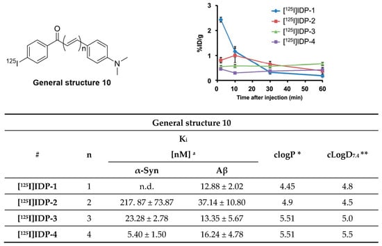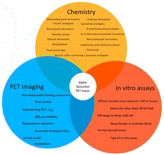 A successful PET tracer for neuroimaging is dependent on several key parameters (Figure 4) [73]. First, the ligand must be labeled in sufficient amounts (activity yield >500 MBq). Usually, carbon-11 (11C) or fluorine-18 (18F) are the nuclides of choice for small molecule-based PET neuroimaging tracers. These nuclides display excellent decay characteristics for PET imaging (short half-life, good branching ratio, and short positron range) [74] and radiotracers labeled using these radionuclides can also be produced in good radiochemical yields (RCY) in most well-equipped radiopharmacies (activity yield >500 MBq) [75]. Additionally, potential ligands can be radiolabeled with these isotopes without introducing bulk and charge, which often prevents sufficient blood-brain barrier (BBB) penetrance. BBB permeability should be high with an early standard uptake value (SUV) >1.0 [54] (within several minutes, for example 5-10 min). Brain uptake for amyloid tracers is recommended to be ≥ 0.4% ID/g in rat brain or ≥ 4.0%ID/g in mouse brain [54]. Additionally, the plasma clearance half-time should be fast (less than 30 min) [54] to reduce background signal from blood. Ideally, the tracer binds reversibly to its target and no metabolites exist within the brain. These characteristics greatly simplify kinetic modeling and allow for appropriate quantification and reproducibility [56]. The tracer should show a low non-displaceable binding component to increase signal-to-noise ratio within the brain [54] and has to be accessible in high molar activity (Am) (>50 GBq/µmol, we believe) to avoid target saturation or non-negligible self-blocking [76,77]. An additional key parameter for any successful neuro PET tracer is its selectivity toward off-targets expressed or deposited in same brain regions. A recommended selectivity over these off-targets is thought to be > 30–100 [78]. For a successful α-syn PET tracer, the MJFF has published a criteria list, which has to be fulfilled to receive the MJFF Alpha-synuclein Imaging Prize [79]. We have adapted this list and will use it to assess the ability of published structures to image α-syn via PET (Figure 4).