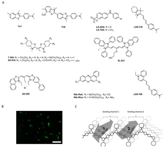 (A) Chemical structures of fluorescent probes and cyanine dyes. (B) ThS positive neurons confirming α-syn pathology (adapted from Patterson et al.) [88]. (C) Hypothetical presentation of how mono- and trimethine cyanine dyes interact with α-syn fibrils (reprinted with permission from [83]. Copyright 2008 Elsevier).