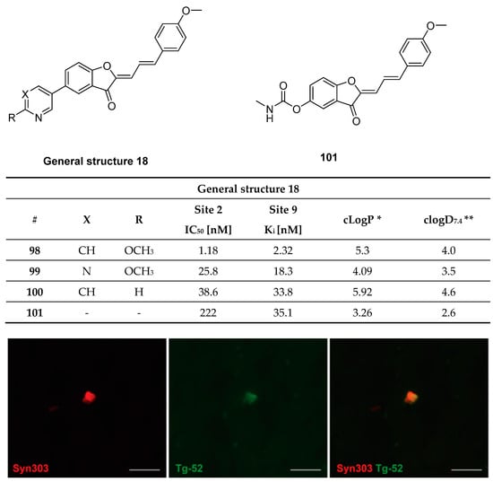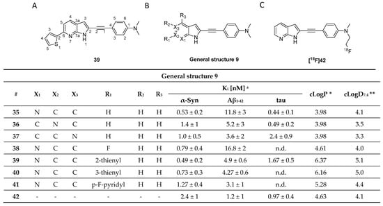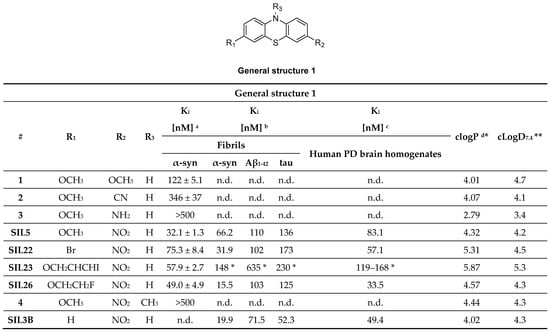 Phenothiazine analogues with binding properties determined from two different assays. a Affinity toward α-syn fibrils determined by ThT fluorescence assay [92]. b Affinity toward recombinant α-syn and tau and synthetic Aβ1–42 fibrils determined by [125I]SIL23 competition assay [55]. c Affinity toward human PD brain homogenate determined by [125I]SIL23 competition assay [55]. * Kd value determined with the radioligand [125I]SIL23 on fibrils or human PD brain homogenate. * clogP computed from BioByte software. ** clogD7.4 computed from ACD/Percepta. n.d.: not determined.