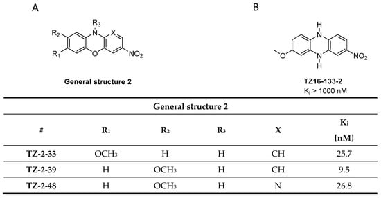 General structure of phenoxazine and phenazine analogues. (A) Chemical structure of phenoxazine analogues with binding properties utilized from ThT fluorescence assay using α-syn fibrils [97]. (B) Chemical structure of phenazine analogues TZ16-133-2 with binding affinity Ki > 1000 nM [97].