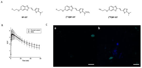 (A) Chemical structures of BF-227, [11C]BF-227 and [18F]BF-227. (B) TACs of [11C]BF-227 in putamen in normal controls and MSA patients (Reprinted with permission from [100]. Copyright 2010 Oxford University Press). (C) Fluorescence detection of BF-227 (at 100 µM) using MSA brain sections. (a) Tissue autofluorescence (in green) that is imaged prior to BF-227. (b) BF-227 labeling (in blue) of few inclusions. Microscopic examination under DAPI (blue, exposure 500 ms) and FITC (green, exposure 100 ms) filters (adapted from [101]).