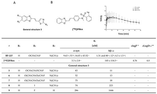 (A) General structure of BF-227-like compounds with binding properties specified in table. Affinities were determined for α-syn and Aβ1–42 fibrils. Binding affinities were determined by several techniques: a Kd values identified with Scatchard analysis [99,103]. b In vitro saturation assay using synthetic α-syn and Aβ1–42 fibrils [67]. c In vitro saturation binding assay [67]. d In vitro binding assays (Ki) determined for Aβ1–42 fibril in competitive binding assay using [125I]BF-180 [98]. * clogP values were calculated by BioByte. ** clogD7.4 values calculated by ACD/Percepta. (B) The chemical structure of [18F]2FBox with the TAC from small-animal PET imaging of fibril-injected rats (controls were taken from the striata regions) (reprinted with permission from [67]. Copyright 2018 American Chemical Society).